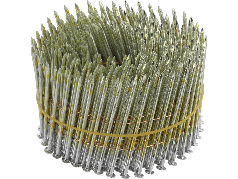 Оцинковані барабанні цвяхи, з’єднані дротом під кутом 15° - 16°, найчастіше використовуються в покрівлі, наприклад: при кріпленні гудрону, у будівництві та для з’єднання дерев’яних елементів, особливо там, де цвях може бути підданий впливу погодних умов. Оцинкування знижує ризик появи іржі. Барабанні цвяхи використовуються з барабанним цвяхозабійником. Підходить для цвяхозабивачів: YT-09213, YT-09214 Діаметр головки: 5,95 - 6,45 мм ±0,25 мм Діаметр з'єднувального дроту: 0,68 мм Кількість котушок: 300 шт./з. Вага котушки: 70 мм - 0,83 кг 1 коробка = 3,6 тис.