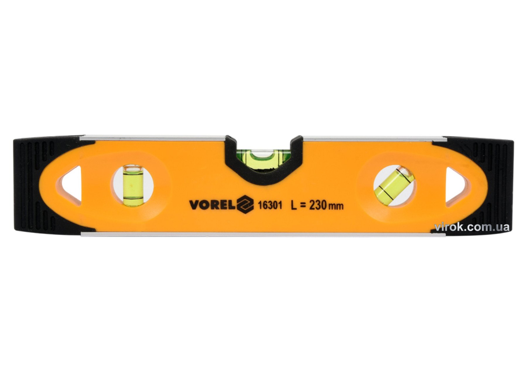 Рівень VOREL 16301 торпедного типу призначений для простих вимірювальних задач. Корпус виконаний з ударостійкого ABS-пластику. Має три капсули – 0˚, 90˚ і 45˚. Магнітна основа полегшує вимірювання на металевих поверхнях. Краї рівня армовані з алюмінієвих профілей. Кінці закріплені резиновими прокладками, які поглинають потужність випадкових ударів.