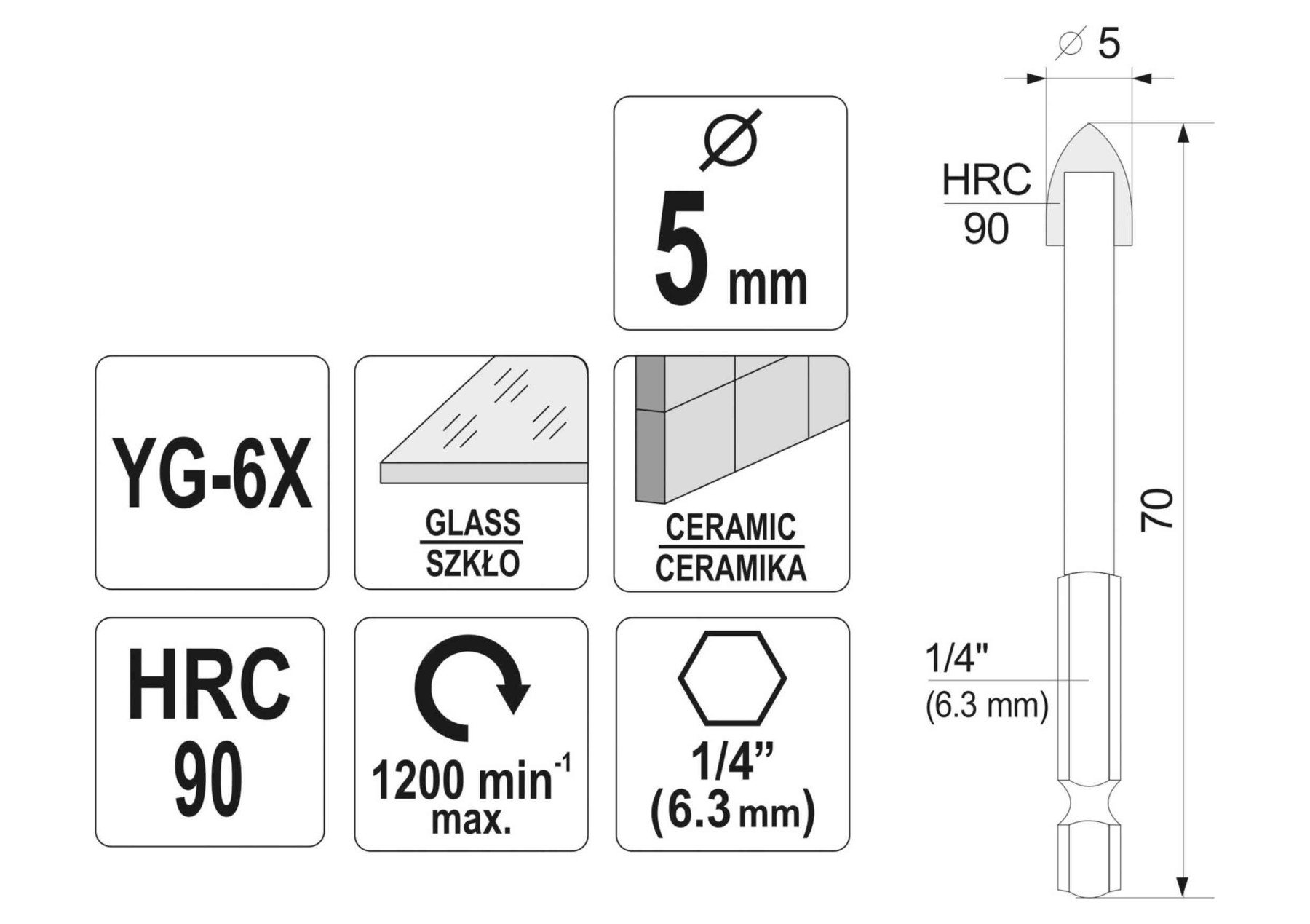 Свердло по склу і кераміці STHOR : YG6X, HEX-1/4", Ø= 5 x 70 мм [125]