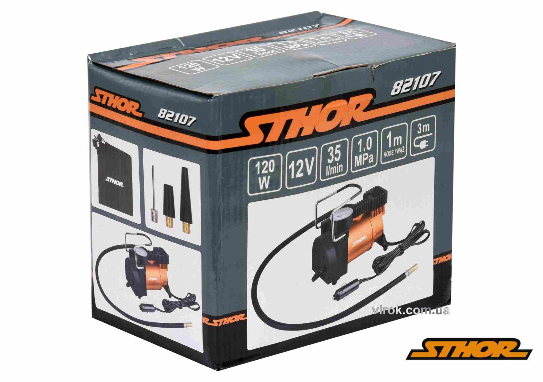 Компресор автомобільний STHOR : 12 В, 120 Вт, 35 л/хв, тиск- 1 МПа + шланг 1 м, 3 насадки, мішок [8]