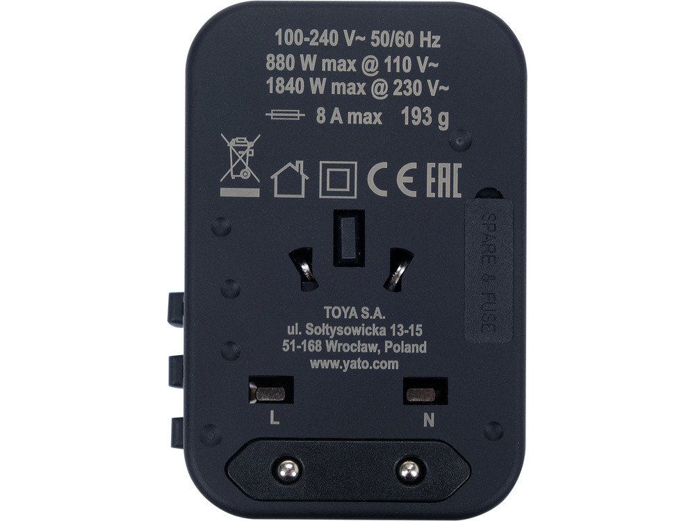 Розетка-адаптер мережева YATO 110-240 В, до 8А з універс гніздом і вилками 880/1840 Вт 110/230 В
