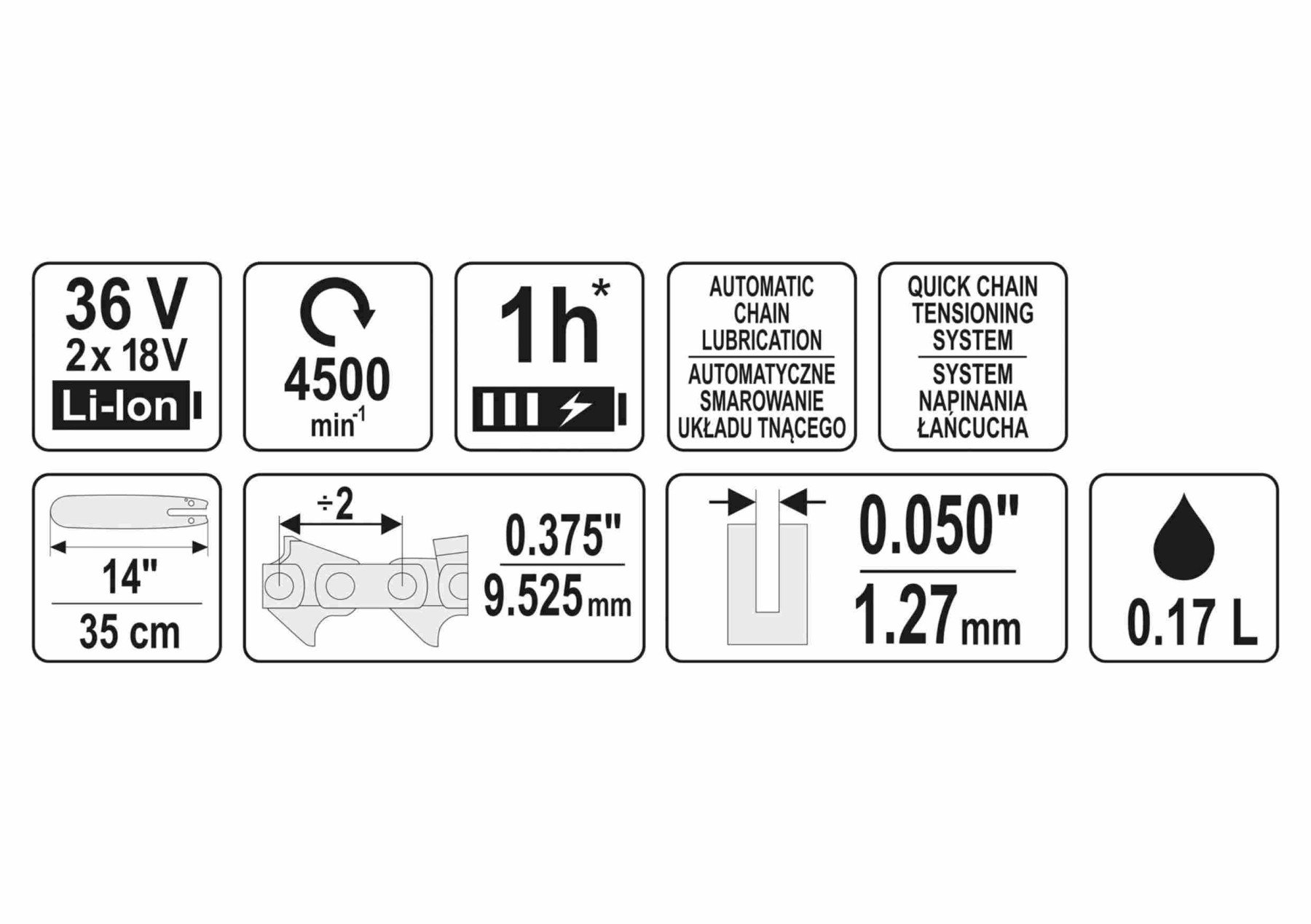 Пила ланцюгова акумуляторна YATO : 36 В (2 x Li-Ion 18 В), шина- 14"/35 см (БЕЗ АКУМУЛЯТОРА) [2/24]