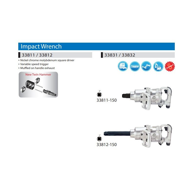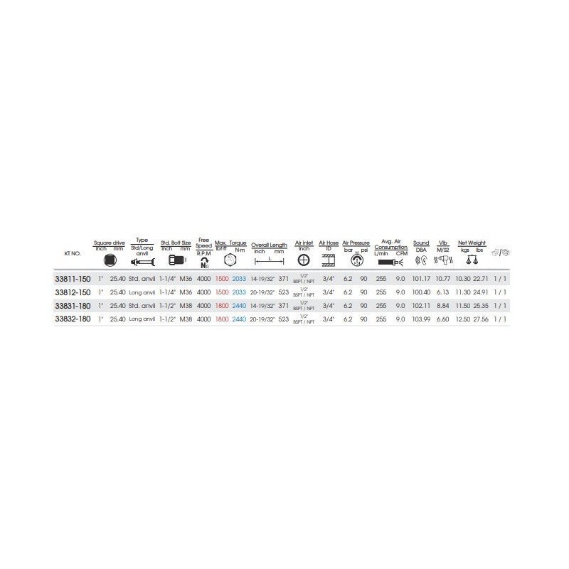 · Посадковий квадрат для торцевих головок 1”.· Граничне зусилля – 2440 Нм.· Швидкість обертання шпинделя – 4000 оборотів за хвилину.· Робочий тиск повітря – 6.2 бар.· Підключення до пневматичної системи – шланг 1/2".· Довжина інструменту з валом – 523 мм.· Рівень шуму - 104 дБ. · Вага гайковерта – 12.5 кг. -