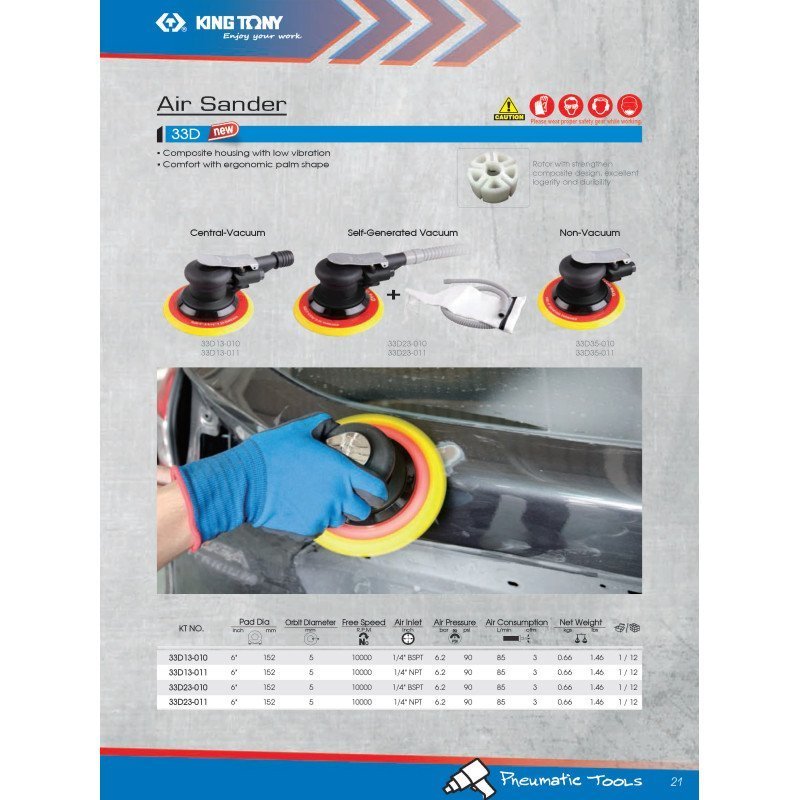 Пневматична шліфувальна машина KING TONY 33D13-010 Швидкість обертання 12000 об/хв; Діаметр штуцера 1/4 дюйми; Витрата повітря 227 л/хв; Діаметр диска 150 мм; Вага 0.85 кг; Комплектація шліфувальний диск, шланг, мішок для збирання пилу, штуцер, ключ. ; Вихлоп із глушником; Три режими роботи: безвакуумний, пилосос, вакуумний; Ергонімічний дизайн для зручного виконання затірки фарби; Як альтернативу для уловлювання відходів роботи можна використовувати мішок для пилу або промислового пилососа; Підходить для робіт з металу, пластику та дерева Пневматична орбітальна шліфувальна машина під пилосос Досягти результату в роботі та ефекту абразивного шліфування з орбітальною машиною простіше, ніж з іншим пневматичним інструментом. Адже крім обертання шпинделя по осі відбувається додаткове зміщення орбіти на 3-5 мм через вбудований ексцентрик у вигляді еліпсоїда. Дерево, метал, пластик, цегла - нескінченний список твердих поверхонь, з якими впорається пневматична орбітальна шліфувальна машина. Компактні розміри, зручність регулювання частоти обертання шпинделя, комфортна для роботи вага та продуктивність ручного інструменту допоможуть майбутньому власнику визначитися з вибором. Перевага шліфувальної машини – функція примусового видалення пилу, реалізована виведенням під пилосос. З таким інструментом робота в приміщенні комфортабельна та безпечна. Виробник потурбувався про покупця і додав у комплектацію до ручного інструменту шланг із мішком для збирання пилу. Забезпечте орбітальну шліфувальну машину надійним компресором, довгими шлангами підведення повітря та забудьте про шум у процесі роботи. Адже перевага пневматичного ручного інструменту полягає у створенні комфортних умов для користувача.