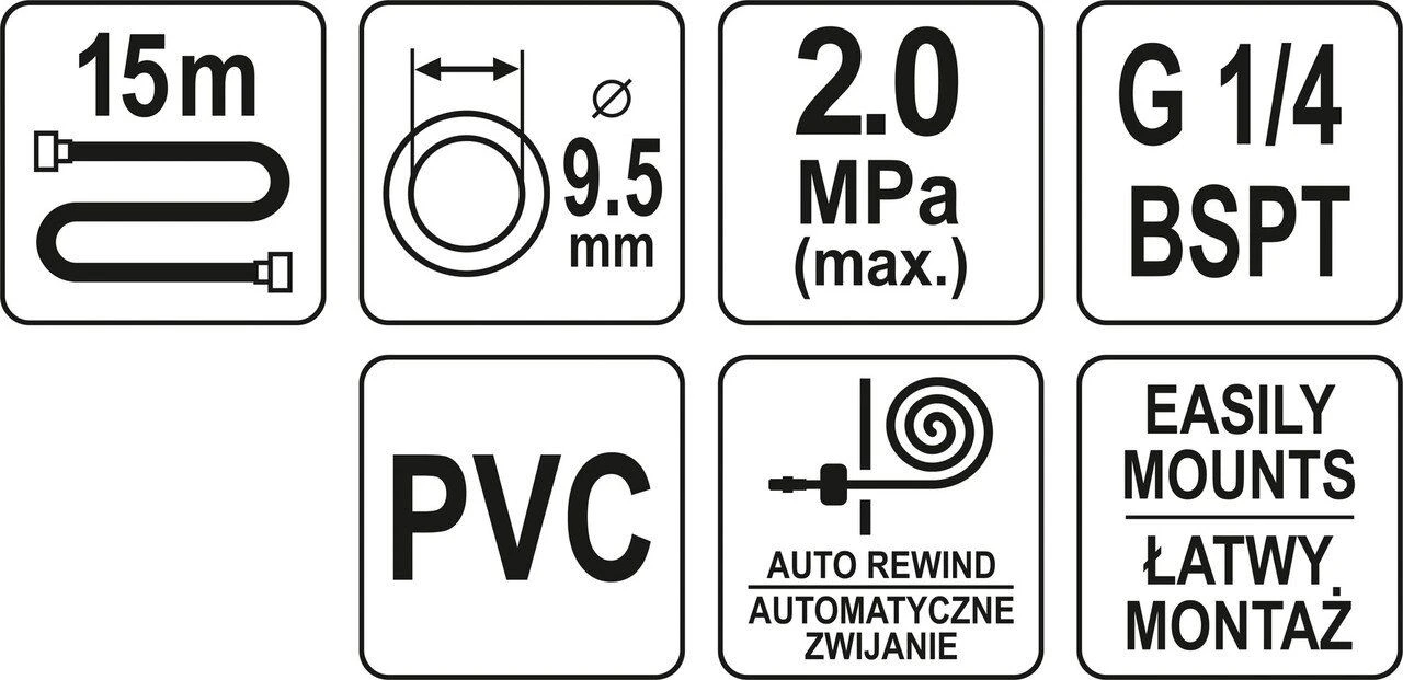 YATO Шланг пневматичний ПВХ на бобіні з швидкоз'єдн. наконеч-ми 1/4", Ø=9.5 мм, тиск- 20 Bar, l=15 м