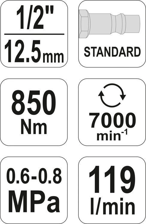 YATO Гайковерт ударний пневматичний : квадрат 1/2", F=850 Nm, роб. тиск- 6-8 Bar при 119 л/хв