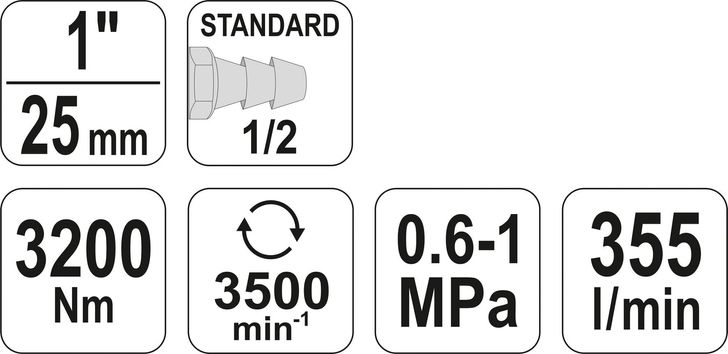YATO Гайковерт ударний пневматичний : квадрат 1", F= 3200 Nm, роб. тиск- 6-10 Bar при 355 л/хв