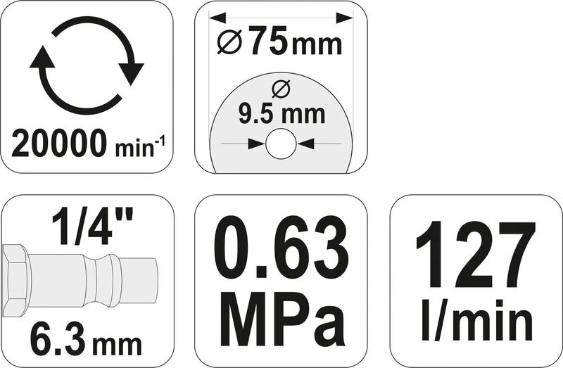 YATO Різак пневматичний, ручний для диска Ø= 75/9.5 мм, Ø= 1/4", 6.3 Bar, 127 л/хв