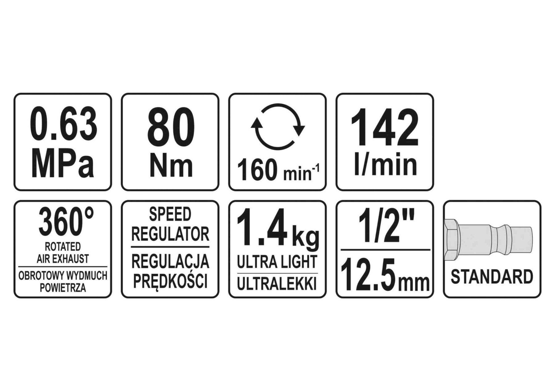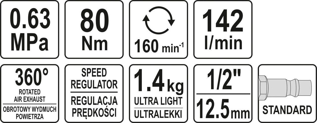 YATO Тріщатка пневматична : квадрат- 1/2", F= 80 Нм, спож. повітря- 142 л/хв, тиск- 6.3 Bar