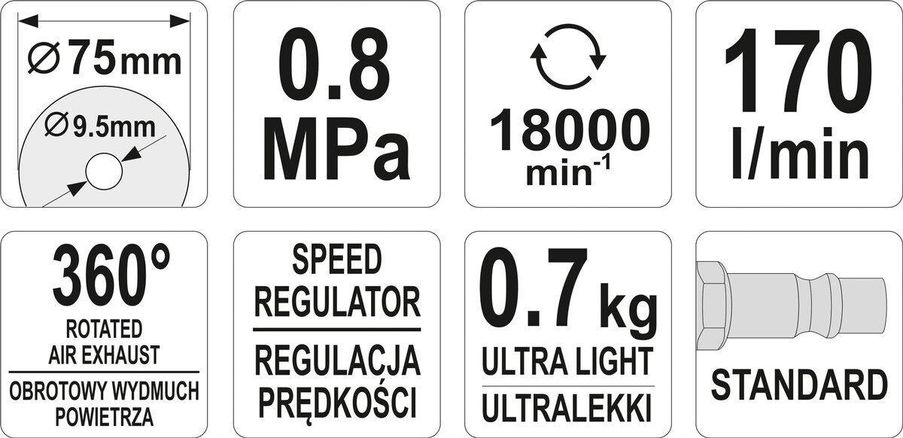 YATO Різак пневматичний, ручний для диска Ø= 75/9.5 мм, Ø= 1/4", 8 Bar, 170 л/хв