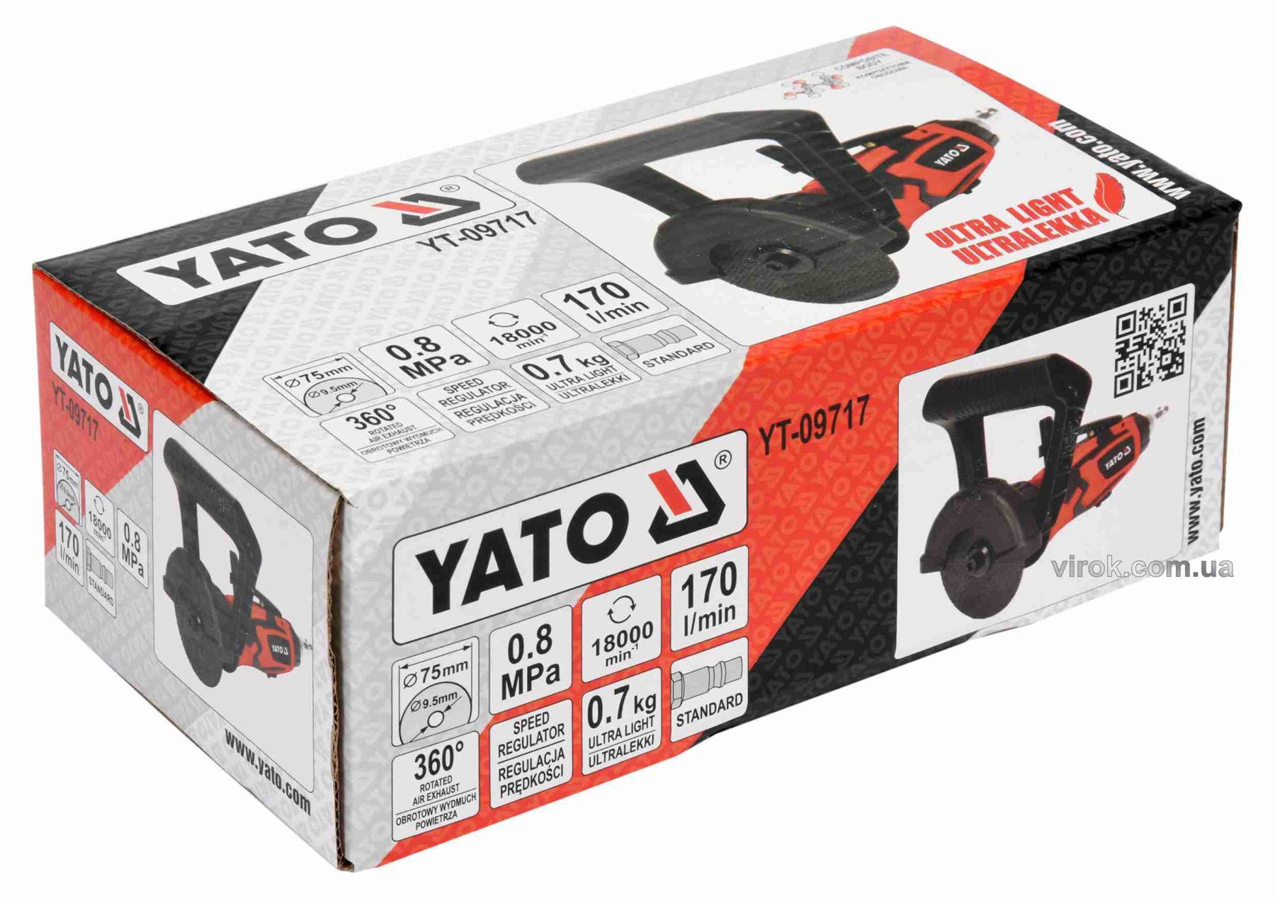 Пневматичний різак YATO YT-09717 живиться від стиснутого повітря під тиском. За допомогою різних кругів дозволяє різати метал, елементи кузова, пластинні конструкції. Застосовується в автосервісах і в промисловості.