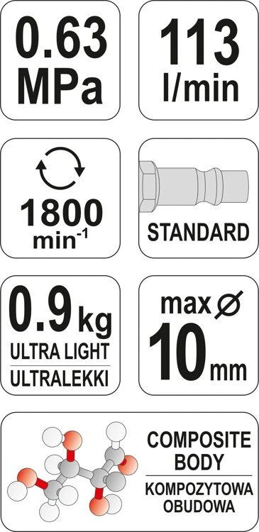 YATO Дриль пневматичний з цангою для свердл Ø≤ 10 мм; роб. тиск- 6,3 Bar з подачою повітря- 113 л/хв
