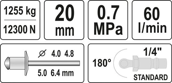 YATO Пневмозаклепочник для нітів Ø= 4,0; 4,8; 5,0; 6,4 мм, 60 л/хв