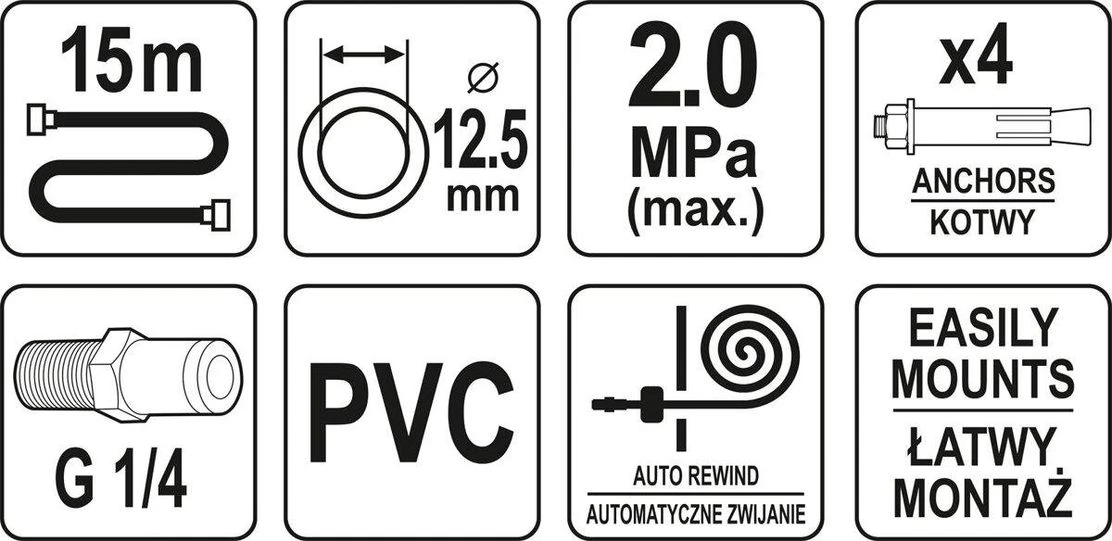 YATO Шланг пневматичний ПВХ на котушці з швидкоз'єдн. наконеч-ми 1/4", Ø=12.5 мм, тиск- 20Bar, l=15м