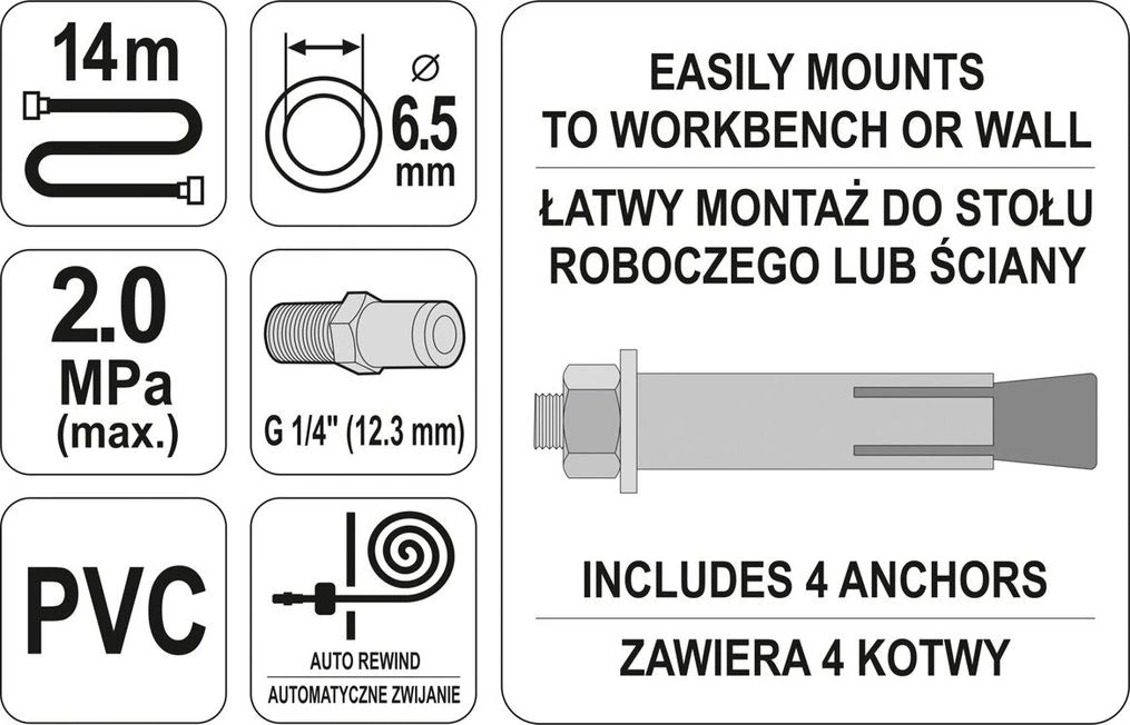YATO Шланг пневматичний ПВХ на котушці з швидкоз'єдн. наконеч-ми 1/4", Ø=6,5 мм, тиск- 20Bar, l= 14м