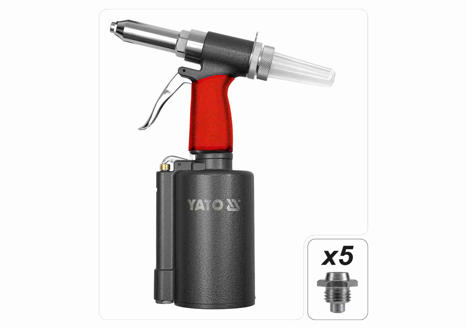Пневмозаклепочник YATO для заклепок Ø= 2,4; 3,2; 4,0; 4,8; 6,4 мм, l= 16 мм, F= 1390 кг [6]