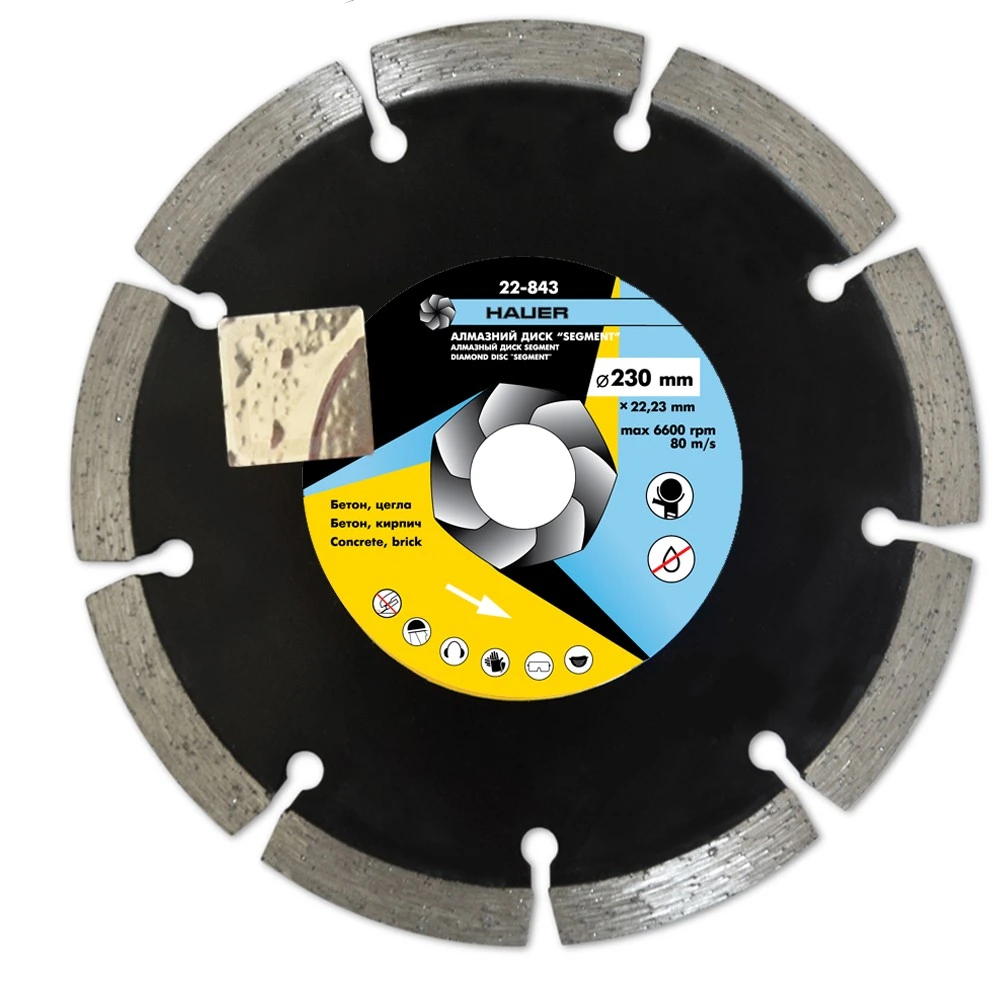 Алмазний диск 'SEGMENT' призначений для швидкого різання бетону, цегли та каменю. Завдяки сегментам диск під час роботи краще охолоджується повітрям, тому його можна використовувати для сухого різу. Також диском можливо різати бетон з додаванням води для охолодження, що значно збільшить термін служби диску. Ріжуча частина має функцію самозаточування, забезпечує високу продуктивність різання, при якому ріжуча кромка самовідновлюється за рахунок видалення зношених і вивільнення нових алмазних елементів. Сегментні диски найкраще підходять для робіт з бетоном. Вміст алмазів більше 20%.