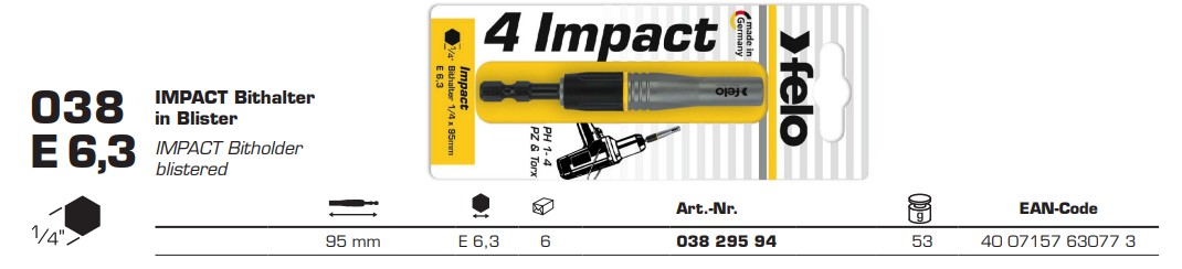 Держатель бит магнитный FELO IMPACT 1/4х95 мм, форма E 6,3, стопорное кольцо, под ударные инструменты, блистерная упаковка, ИР (03829594)
