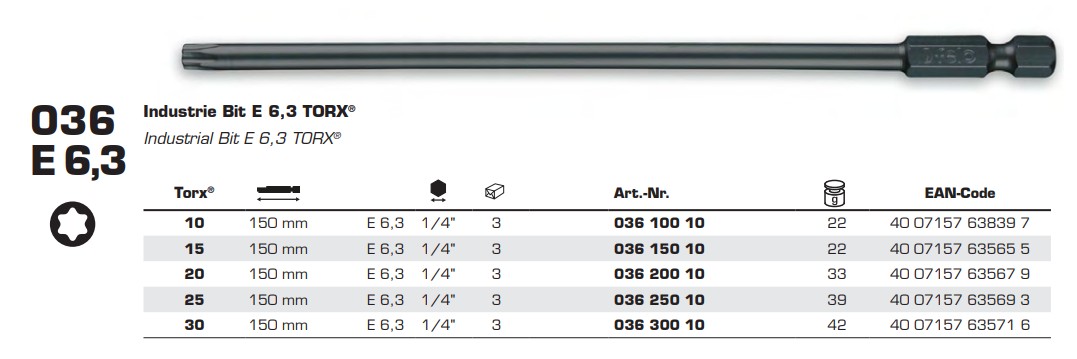 Бита FELO INDUSTRIAL TORX10х150 мм, шестигранный хвостовик 1/4, форма E 6,3, машинная (03610010)