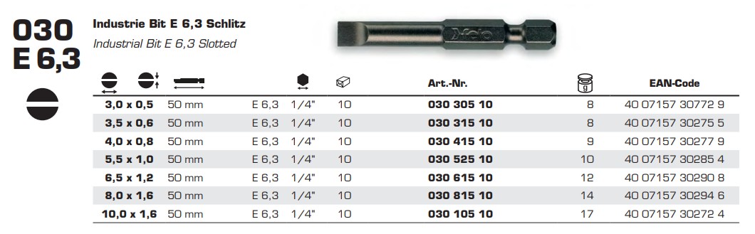 Бита FELO INDUSTRIAL щелей 3,0х0,5x50 мм, шестигранный хвостовик 1/4, форма E 6,3, машинная (03030510)