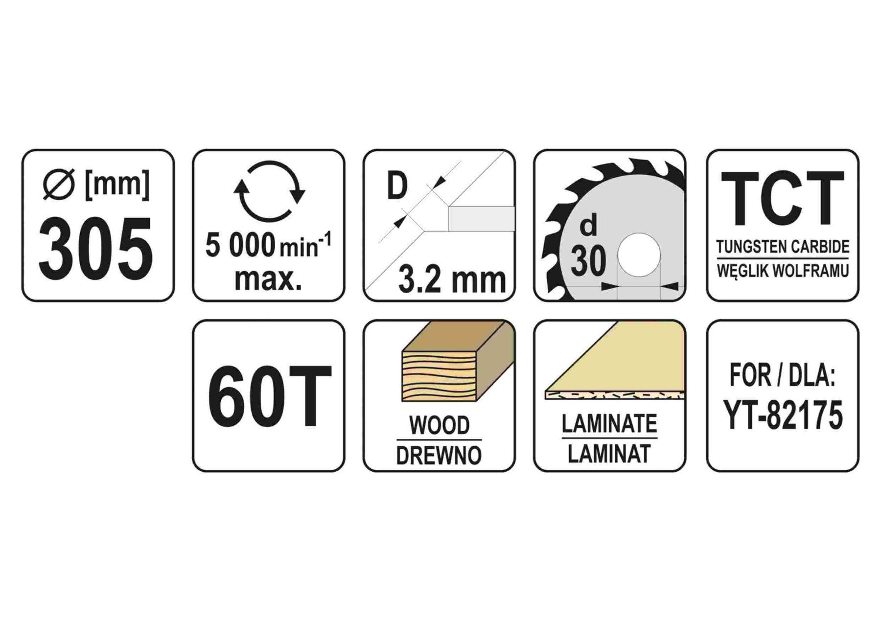 YATO Диск пиляльний победітовий по дереву: 305x30x3.2x2.2 мм, 60 зубців, R.P.M до 5000 1/хв