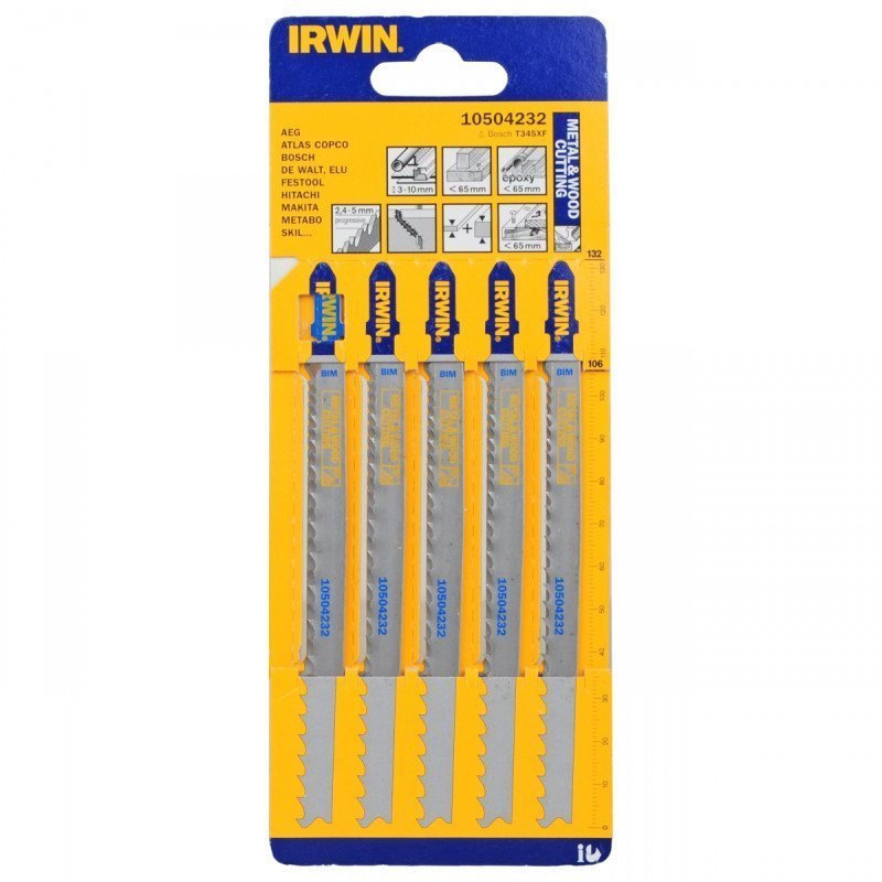 Пилка для лобзика по дереву IRWIN BJSB, 5шт T301CD Пилка для електролобзика для роботи по дереву Матеріал HCS - вуглецева сталь для роботи з м'якими матеріалами: дерево, ламінат, пластик 3 різних кута заточування зубів пилки для чистої та швидкої роботи Т-подібний хвостовик Упаковка: 5 шт.