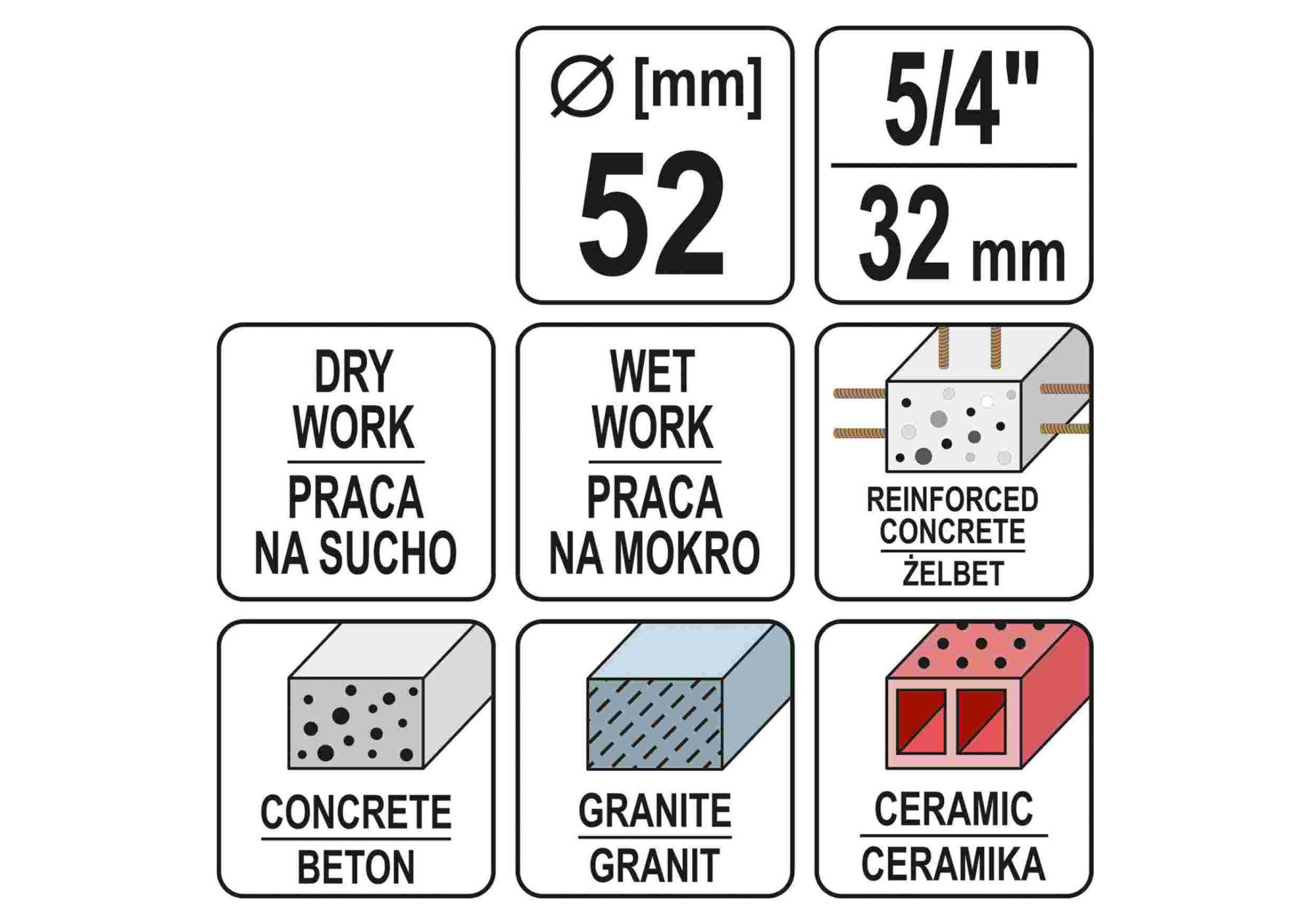 YATO Свердло корончате по каменю, бетону : Ø= 52 мм, l= 430 мм, з алмазн. пругами, хвостовик- М32