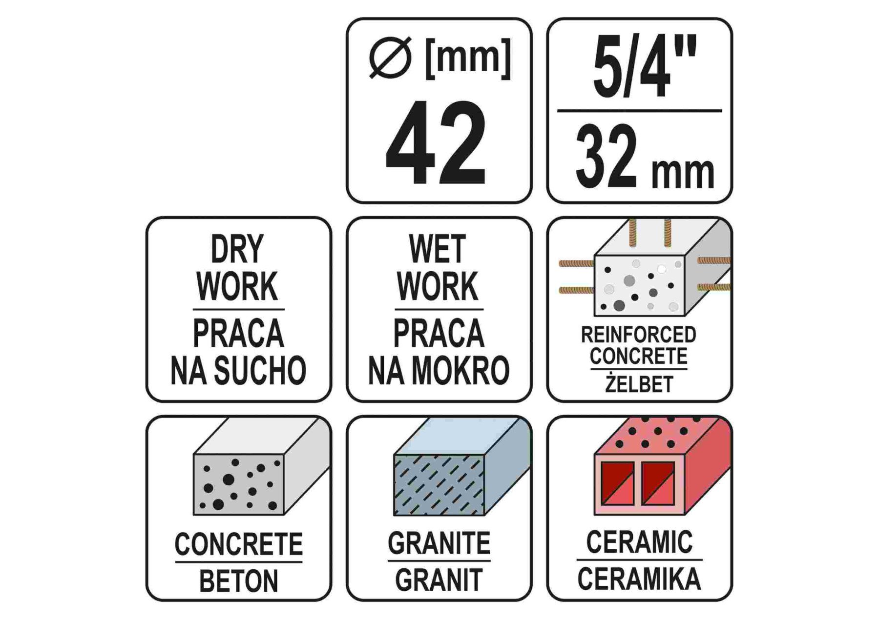 YATO Свердло корончате по каменю, бетону : Ø= 42 мм, l= 430 мм, з алмазн. пругами, хвостовик- М32