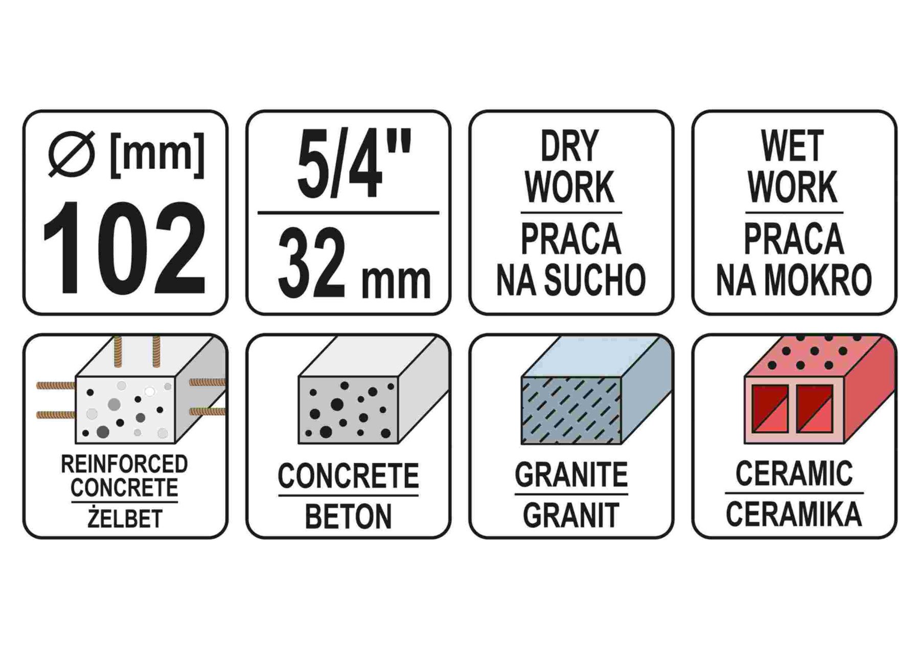YATO Свердло корончате по каменю, бетону : Ø= 102 мм, l= 430 мм, з алмазн. пругами, хвостовик- М32