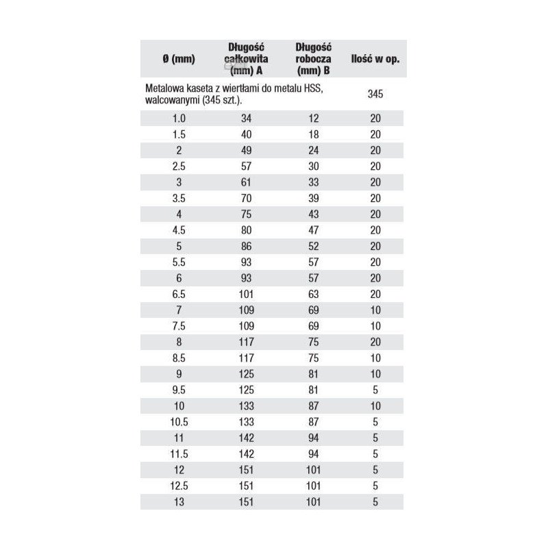 Набір свердел по металу Шафка (345 шт) Особливості Свердла по металу із твердої сталі DIN 338 для високошвидкісного свердління. Стандартна ріжуча кромка у формі долота з кутом заточування 118 °. Оксидне покриття для швидкого видалення стружки. Свердла з N дизайном шнека та стандартним кутом нахилу канавки. Для свердління сталі, чавуну, інших маталів та сплавів з межею міцності на розрив 800 Н/мм. Колір чорний Кількість в упаковці:345 Комплектація Свердло по металу HSS-R DIN338 1.0 х 34 мм - 20 шт Свердло по металу HSS-R DIN338 1.5 х 40 мм - 20 шт Свердло по металу HSS-R DIN338 2 х 49 мм - 20 шт Свердло по металу HSS-R DIN338 2.5 х 57 мм - 20 шт Свердло по металу HSS-R DIN338 3 х 61 мм - 20 шт Свердло по металу HSS-R DIN338 3.5 х 70 мм - 20 шт Свердло по металу HSS-R DIN338 4 х 75 мм - 20 шт Свердло по металу HSS-R DIN338 4.5 х 80 мм - 20 шт Свердло по металу HSS-R DIN338 5 х 86 мм - 20 шт Свердло по металу HSS-R DIN338 5.5 х 93 мм - 20 шт Свердло по металу HSS-R DIN338 6 х 93 мм - 20 шт Свердло по металу HSS-R DIN338 6.5 х 101 мм - 20 шт Свердло по металу HSS-R DIN338 7 х 109 мм - 10 шт Свердло по металу HSS-R DIN338 7.5 х 109 мм - 10 шт Свердло по металу HSS-R DIN338 8 х 117 мм - 20 шт Свердло по металу HSS-R DIN338 8.5 х 117 мм - 10 шт Свердло по металу HSS-R DIN338 9 х 125 мм - 10 шт Свердло по металу HSS-R DIN338 9.5 х 125 мм - 5 шт Свердло по металу HSS-R DIN338 10 х 133 мм - 10 шт Свердло по металу HSS-R DIN338 10.5 х 133 мм - 5 шт Свердло по металу HSS-R DIN338 11 х 142 мм - 5 шт Свердло по металу HSS-R DIN338 11.5 х 142 мм - 5 шт Свердло по металу HSS-R DIN338 12 х 151 мм - 5 шт Свердло по металу HSS-R DIN338 12.5 х 151 мм - 5 шт Свердло по металу HSS-R DIN338 13 х 151 мм - 5 шт