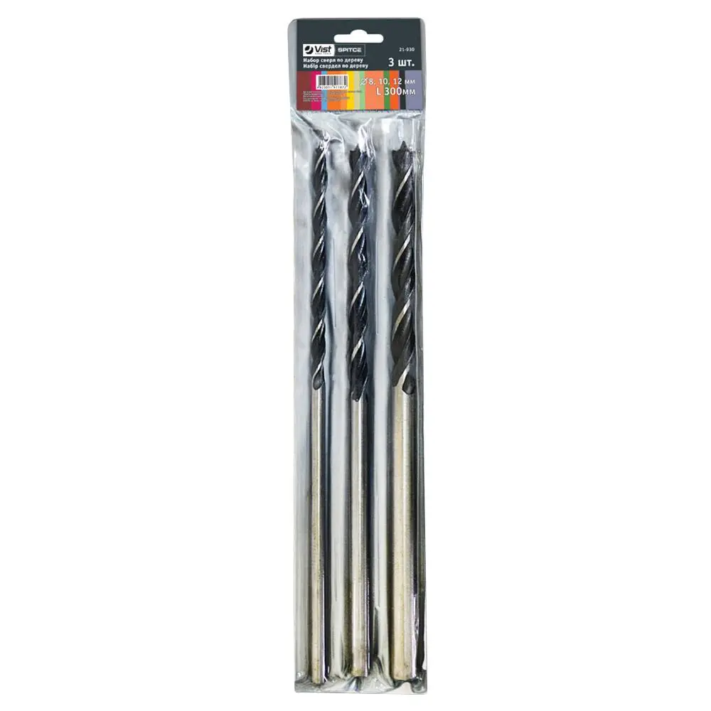 Спіральні свердла подовжені в наборі виготовлені з інструментальної сталі твердість становить 45 - 58 HRC. Наявність спеціального центруючого різця дозволяє швидко і якісно свердлити деревину. За рахунок особливої ??конструкції свердел, що відносяться до гвинтового типу, при їх використанні із зони обробки ефективно видаляється стружка. Гвинтове свердло, крім того, забезпечує високу точність і виключно високу якість виконуваної обробки. Призначені для свердління отворів на велику глибину в твердих та м'яких породах деревини, а також ДСП, МДФ та ін. Набір свердел в поліетиленовій упаковці. Використовуються з ручним електродрилем.