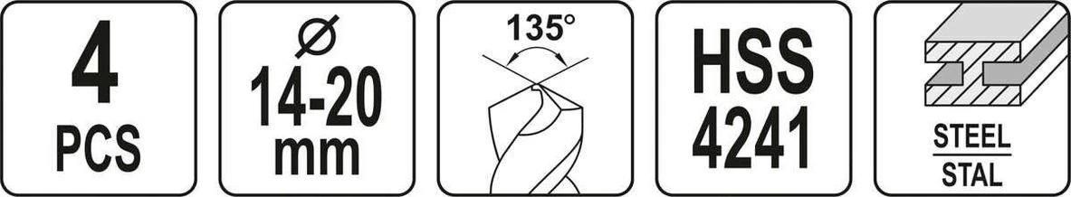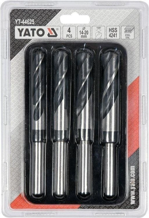 YATO Набір свердл по металу: HSS 4241, Ø14-20 мм, L= 75/150 мм, до нержав. і конструкц. сталі, 4 шт