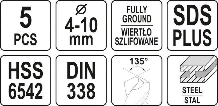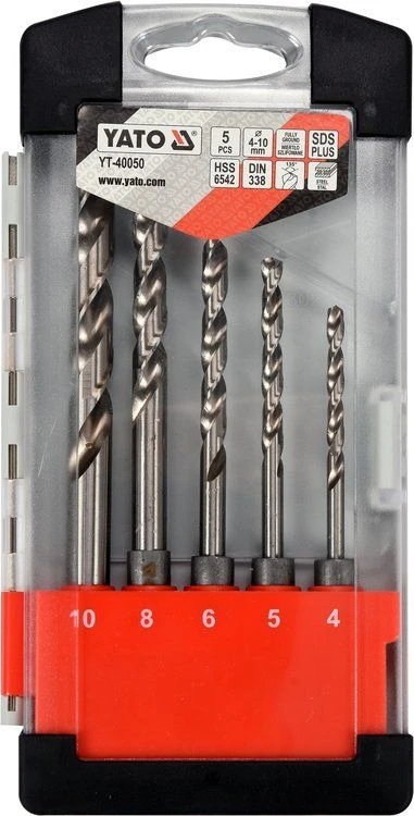 Набор сверл SDS PLUS YT-40050 высокого качества, изготовлены из быстрорежущей стали HSS 6542. Сверла по металлу предназначены для профессионального применения, а именно для сверления в твердых материалах.