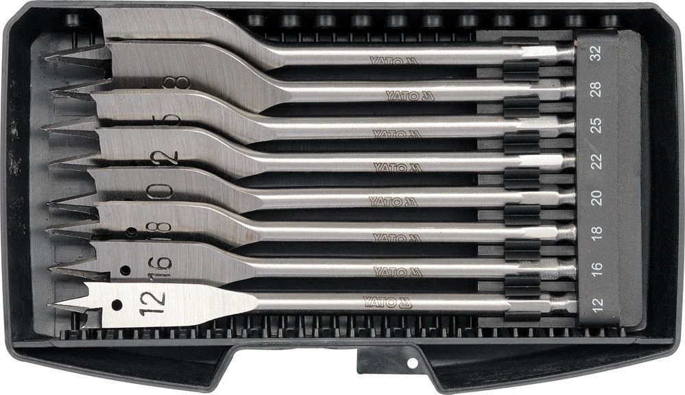 Набор лопастных сверл Yato. Качественная, из закаленной углеродистой стали, закаленная. Предназначен для сверления дерева, мебельного щита, пластика, а также гипсокартона и ячеистого бетона. Шестигранная ручка 1/4' с быстрой заменой наконечника для быстрой замены сверла в рукоятках отвертки.