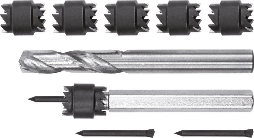 Набор для высверливания точечной сварки YATO YT-28920 предназначен для быстрого удаления швов, сварных соединений, сварных швов кузова автомобиля. Включает в себя 6 двусторонних фрез кружевных, фиксатор, 3 штифта фиксации и специальное сверло HSS 8 мм.