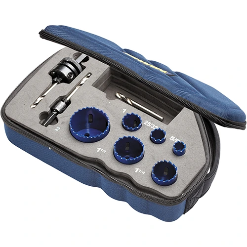 Набір бі-металевих коронок IRWIN 600P Склад набору: 6 шт. кільцевих пилок - 19; 22; 29; 38; 44 та 57 мм. 1 шт. Адаптер із 6-гр. хвостовиком 13 мм для коронок по металу 32 - 152 мм, (артикул 10504535) 1 шт. Адаптер із 6-гр. хвостовиком 9,5 мм для коронок по металу 14 - 30 мм (артикул 10504536) 1 шт. Центрувальне свердло (напрямне), (артикул 10504532) Загальна вага: 1050 кг. Розміри упаковки: 175 х 80 х 280 мм. * Набір біметалічних кільцевих пил Irwin доступний у м'якому нейлоновому (600den) футлярі з міцною блискавкою-застібкою та внутрішнім набиванням для захисту вмісту. Футляр має ручку для перенесення та картонну вкладку з важливою інформацією про продукт. * Оброблюваний матеріал: алюміній, мідь, залізо, нержавіюча сталь, цинк, дерево та гіпс. * Коронки IRWIN виробляються за запатентованою технологією WeldTec, це приварені електронно-променевим зварюванням прецизійні зубці зі змінним TPI з HSS сталі. Змінюваний крок і глибина зубів забезпечує більш швидке різання при меншому зусиллі та підвищену продуктивність у різних матеріалах, а також відмінне відведення стружки. Дно коронки має товсту армуючу пластину для більшої жорсткості, що дозволяє використовувати коронку у складних умовах роботи. Стінки коронки мають отвори для тепловідведення та зручного вилучення залишків стружки.