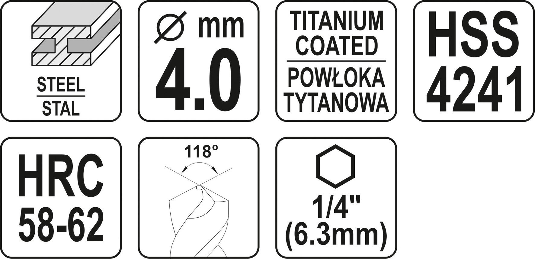 YATO Свердло фрезерувальне по металу : HSS-TIN, Ø= 4 мм, l= 78 мм, HEX - 1/4"