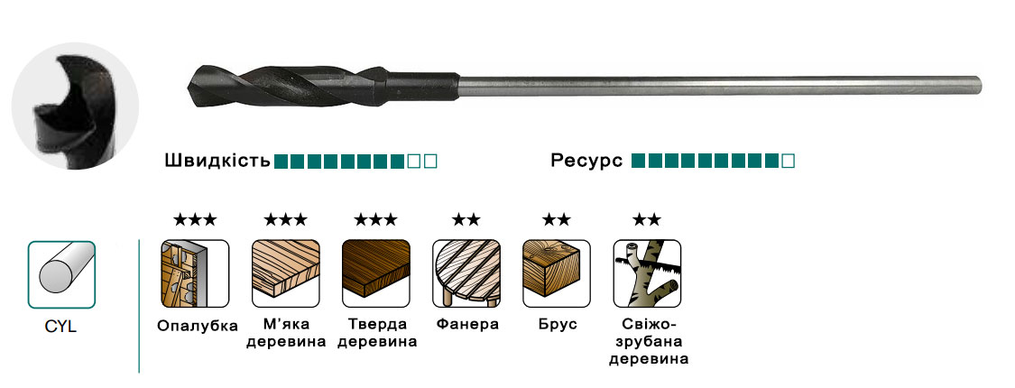 - Хвостовик з відкритим збігом спіралі запобігає заклиненню свердла.