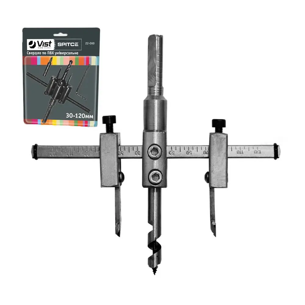 Свердло для ПВХ універсальне. Виготовлено з інструментальної сталі. Різці з твердосплавного металу. Центруюче спіральне свердло має спеціальний центруючий різець, що дозволяє швидко і якісно свердлити деревину, пластик, гіпсокартон. Регулювання потрібного діаметру здійснюється за допомогою ключа або викрутки. На штанзі присутня метрична шкала, по якій встановлюються різці для потрібного розміру діаметра отвору. Щоб отримати якісний отвір і свердло не пішло в сторону перед початком свердління зробіть шилом невелике заглиблення. Весь процес свердління потрібно здійснювати на малих і середніх оборотах, щоб не вийшло відколів на виході свердла, коли потрібно отримати наскрізний отвір. Призначено для свердління отворів у полівінілхлоридних плитах, деревині, фанері, ДСП.