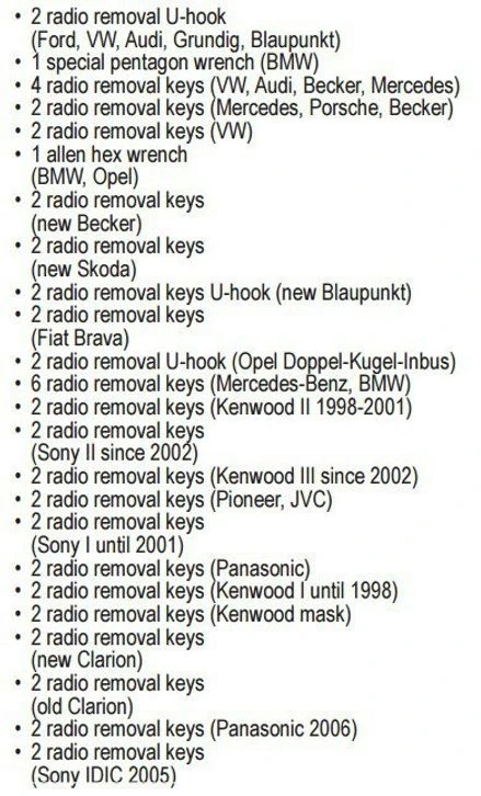Профессиональный набор для демонтажа мультимедийного и аудио оборудования из торпедо автомобиля. Пятьдесят два съемника расположены в удобном и долговечном пластиковом кейсе с защелками. Каждый инструмент находится на своем уникальном месте. Возле посадочного места съемника в кейсе указаны марки автомобилей, у которых данным съемником демонтируется штатное головное устройство (штатная магнитола) или марка универсальной магнитолы, которая может устанавливаться в разные автомобили со стандартными посадочными местами DIN.