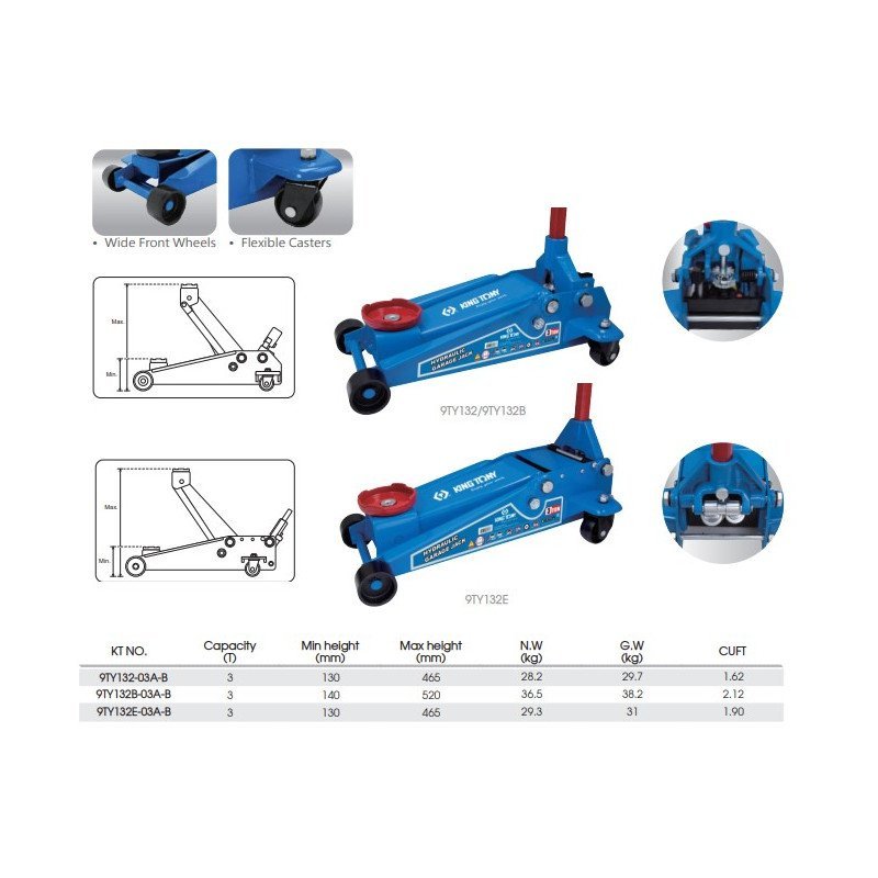Технічні характеристики підкатного домкрата King Tony (9TY132E-03A-B): · Висота підхвату - 130 мм.· Висота підйому – до 465 мм.· Вантажопідйомність – 3 тонни. · Вага домкрата у зборі – 30 кг.