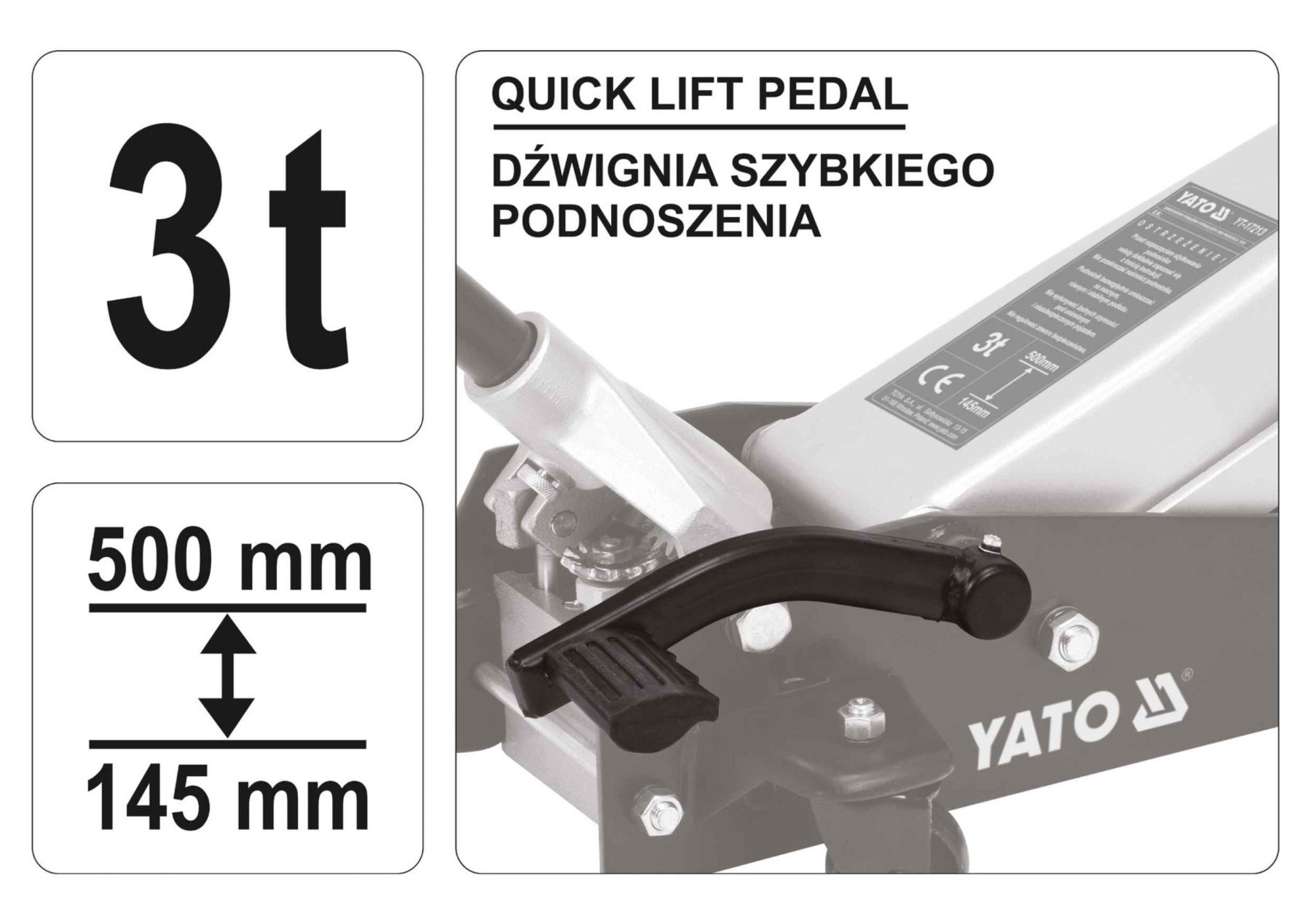 YATO Домкрат гідравлічний підкатний низькопрофільний з важелем швидкого підйому YATO: 3 т, H= 145- 500 мм | YT-17213