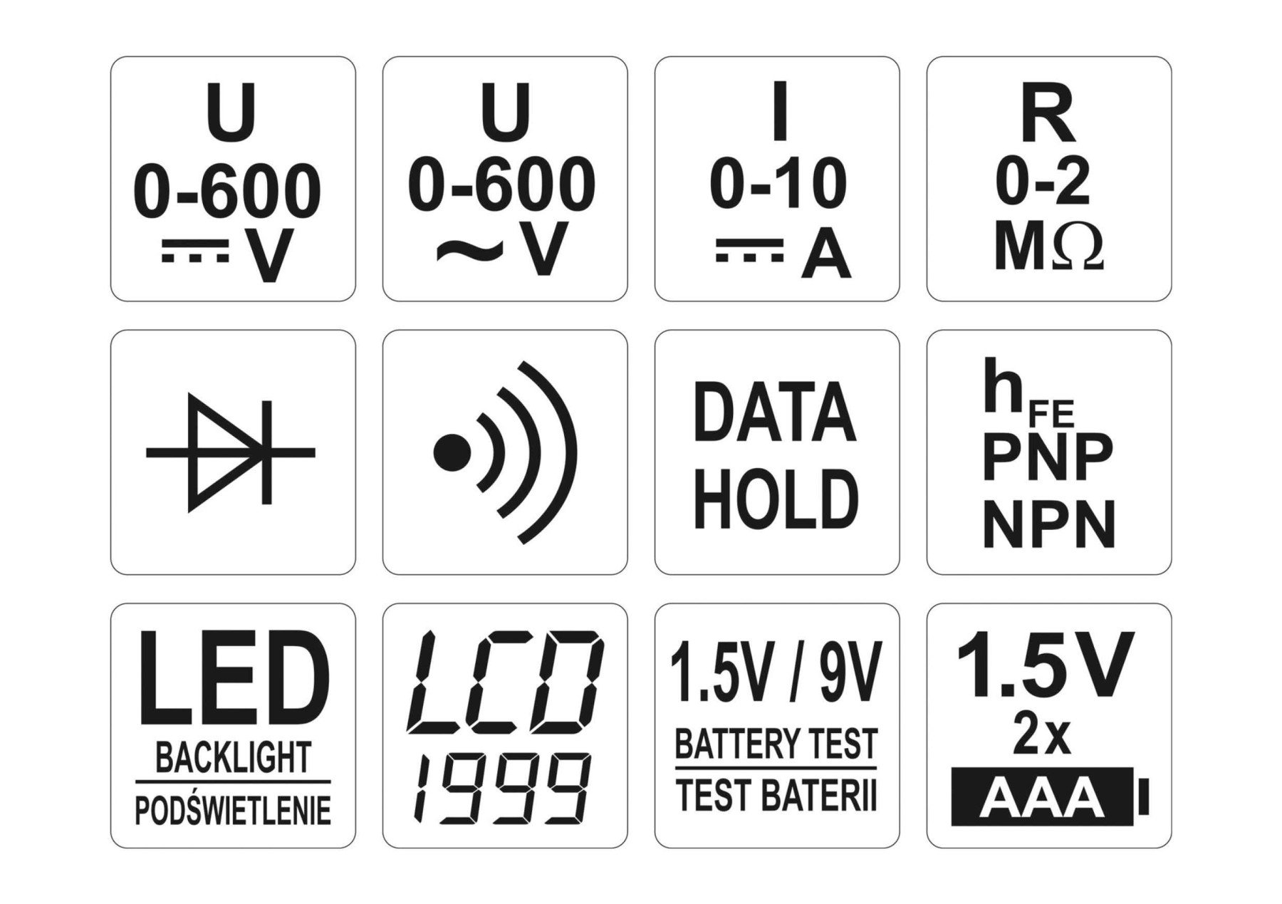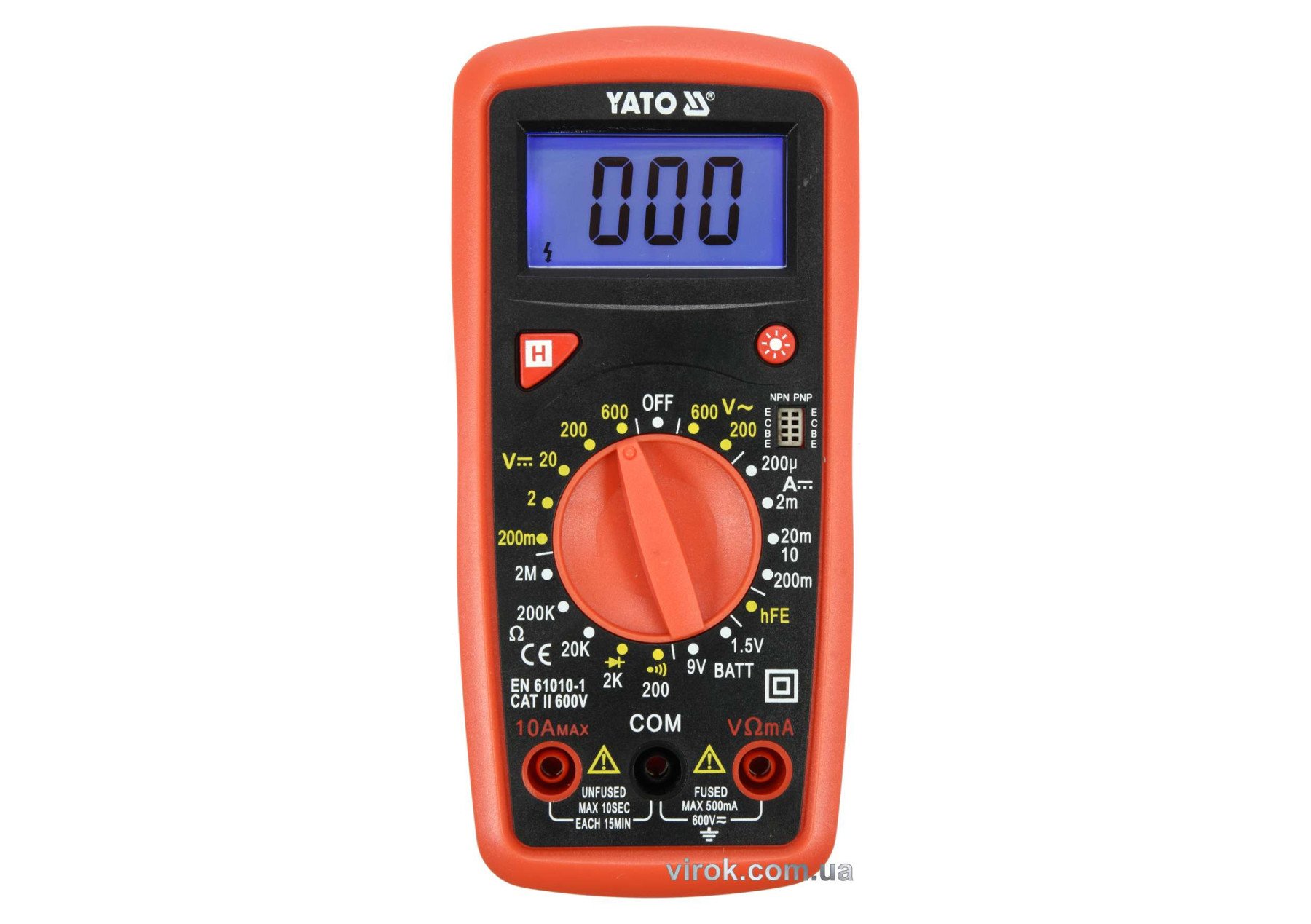 Мультиметр YATO YT-73081 - електричний вимірювач, який призначений для вимірювання напруги та струму, змінного та постійного. Також дозволяє вимірювати опір, провідність та контроль стану індикаторів. Мультиметр має пластиковий корпус і рідкокристалічний дисплей. Пристрій поставляється з вимірювальними проводами зі штирями на кінцях.