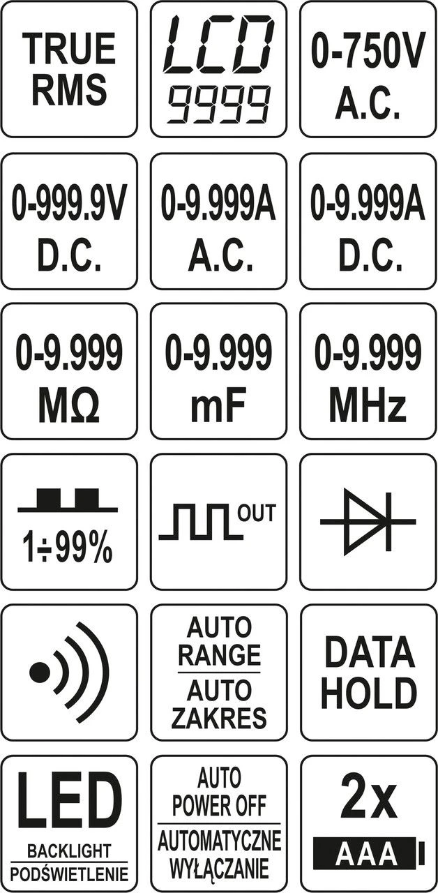 - Измерение переменного напряжения: A.C. 0-750 В, TRUE RMS.