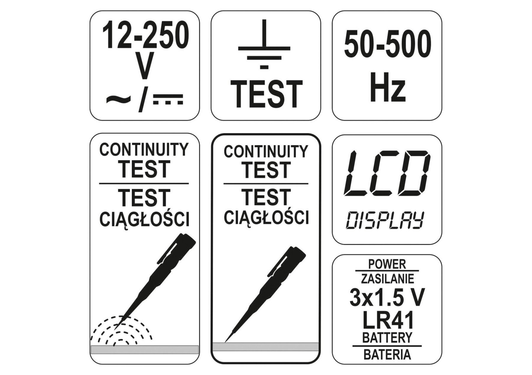 Електричний індикатор YT-28630 з рідкокристалічним дисплеєм дозволяє встановити наявність електричної напруги змінного і постійного струму, виявити змінну напругу індукційним методом, а також провести перевірку цілісності проводів. Про наявність напруги сигналізує індикація на рідкокристалічному дисплеї і загоряння світлодіода.