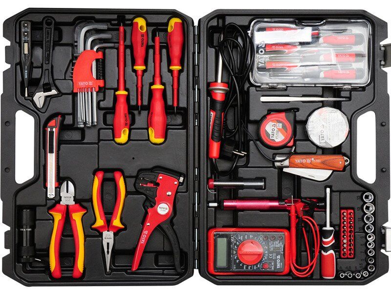 Професійний набір інструментів для електриків із 68 спеціально підібраних інструментів. Це хороший вибір як для електричної, так і автомобільної промисловості. Щипці та викрутки в наборі ізольовані до 1000 В.