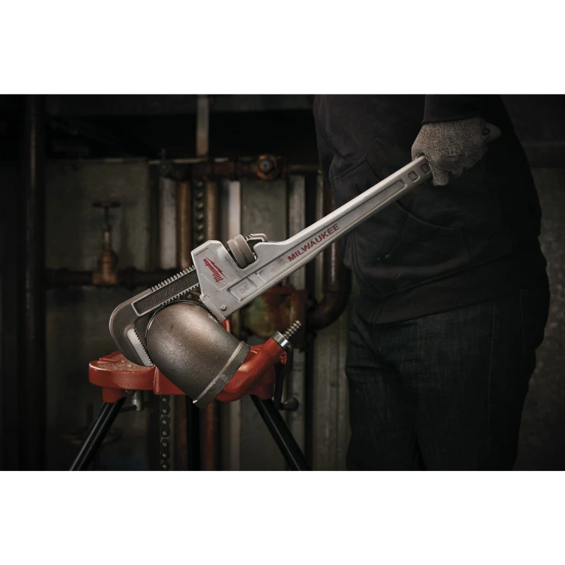 Трубний ключ 24" ALUMINUM. Overbite Jaw – максимальне зчеплення з поверхнею. Компенсаційний хід губок для надійного захоплення труб та фітингів. Подвійне різьблення для забезпечення максимальної міцності та стійкості інструменту. Ергономічна конструкція рукоятки забезпечує максимальну зручність та комфортне положення інструменту в руці. Загартовані губки для збільшення довговічності та кращого зчеплення Отвір під ремінець для носіння на руці. Комплект поставки: Алюмінієвий трубний ключ Milwaukee 600 мм - 1 шт. Постачається в блістері Тип алюмінієвий трубний ключ Вага (гр) 2.644 Макс. діаметр труби (мм) 76 Загальна довжина (дюйм) 24 Загальна довжина (мм) 600