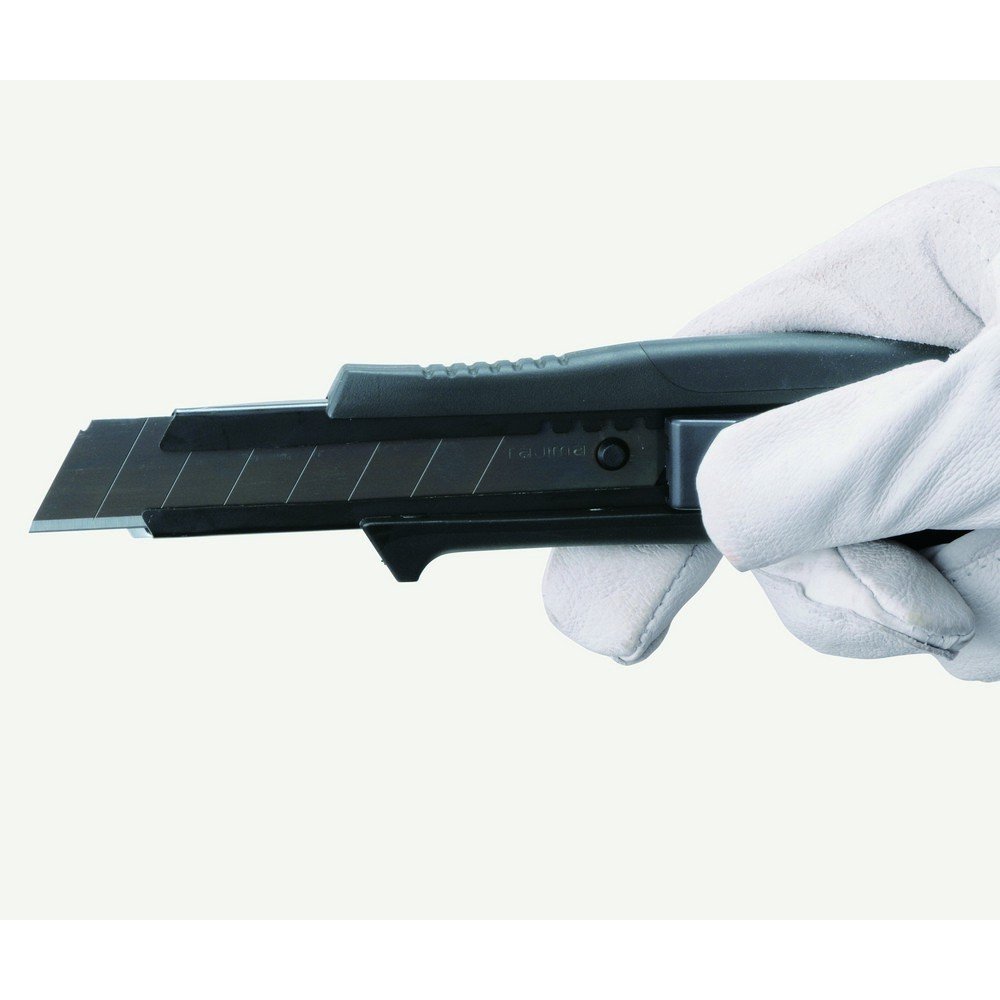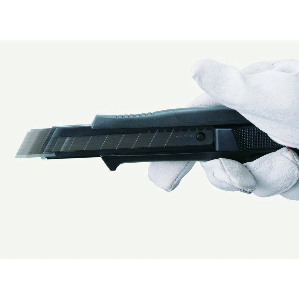 - Используя черный ползунок, нож работает как безопасный - лезвие автоматически прячется в направляющую шахту, когда оператор прекращает держать пальцем фиксатор.