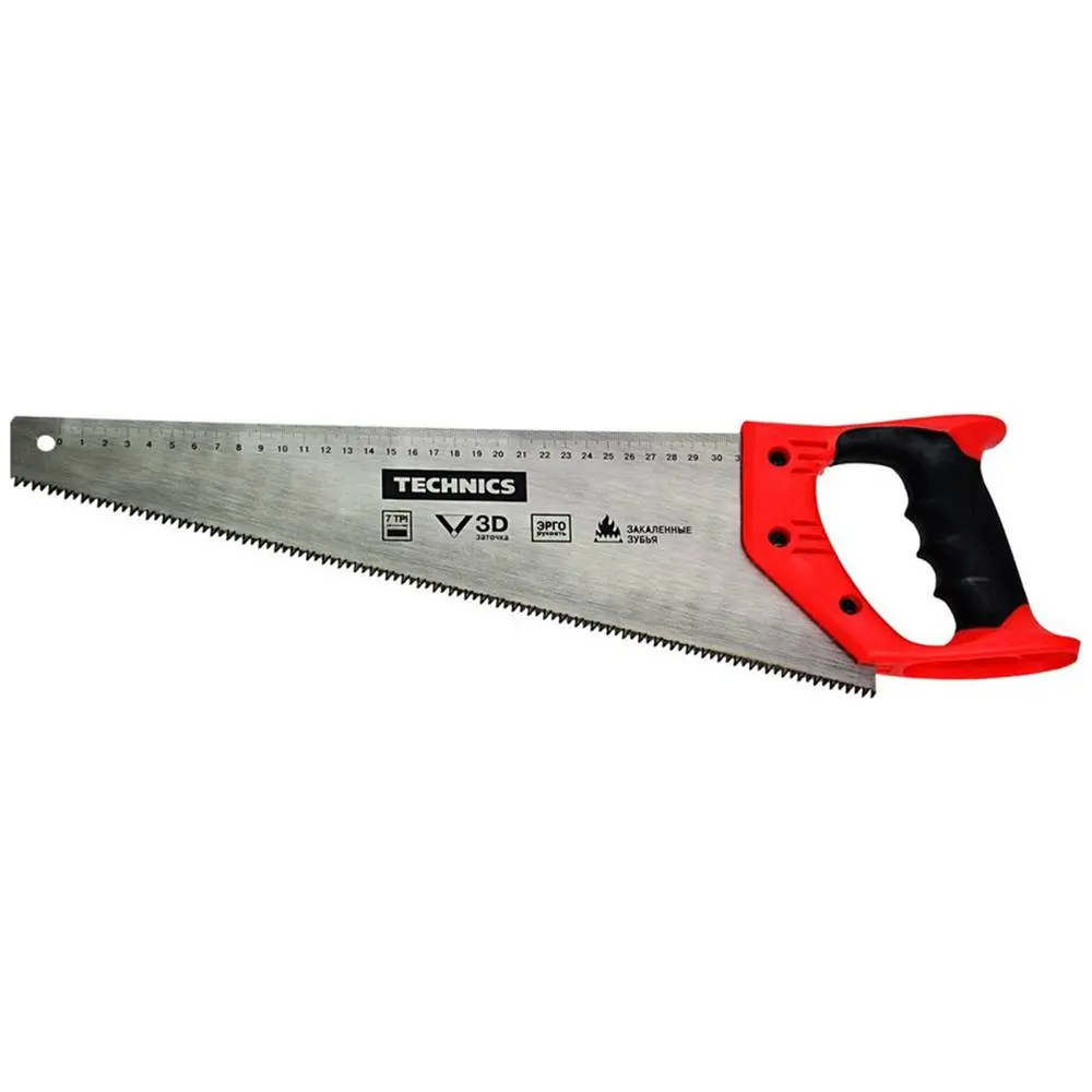 Пила по дереву. Имеет закаленные зубья. Зубья разведены и имеют 3-х гранную заточку, что позволяет пилить в двух направлениях. Шаг зуба - 7 шт / 1 дюйм. Для изделий, которые необходимо пилить аккуратно и ровно, подойдет такая пила с мелким зубом. На полотне пилы нанесены основные характеристики и метрическая шкала для удобства во время работы. Пила оснащена двухкомпонентной (пластик + резина) ручкой закрытой формы, предотвращает ее проскальзывание в руке. Ручка крепится к полотну винтами. Полотно из стали. Предназначена для продольного и поперечного быстрого распила заготовок средних размеров из древесины мягких и твердых пород, ДСП, фанеры, ламината и ПВХ.