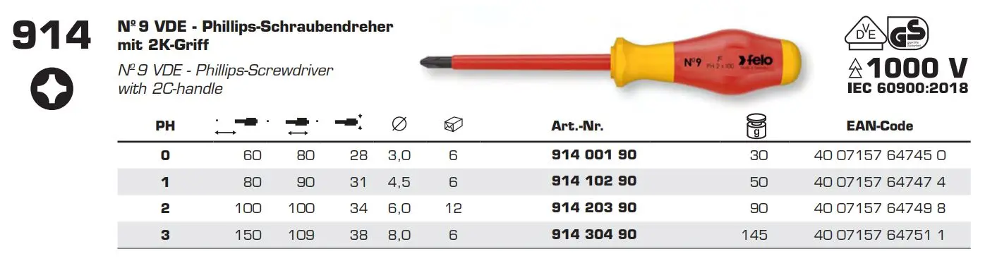 Викрутка FELO діелектрична хрестова 1000V PH0x60х80 мм (91400190)